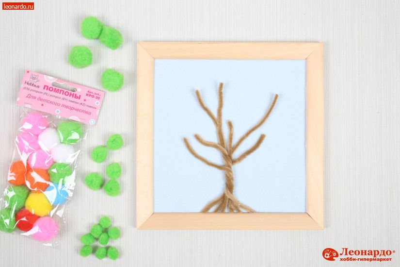8. На этом этапе уже можно вставить композицию в рамку, чтобы контролировать расположение кроны. Подготавливаем зеленые помпоны Hobbius разного размера (арт. KPO-30, KPO-20, KPO-15).