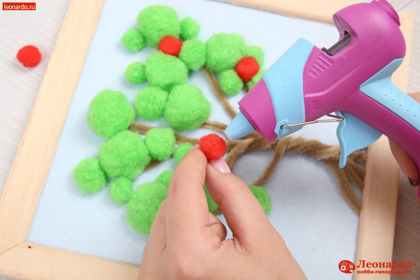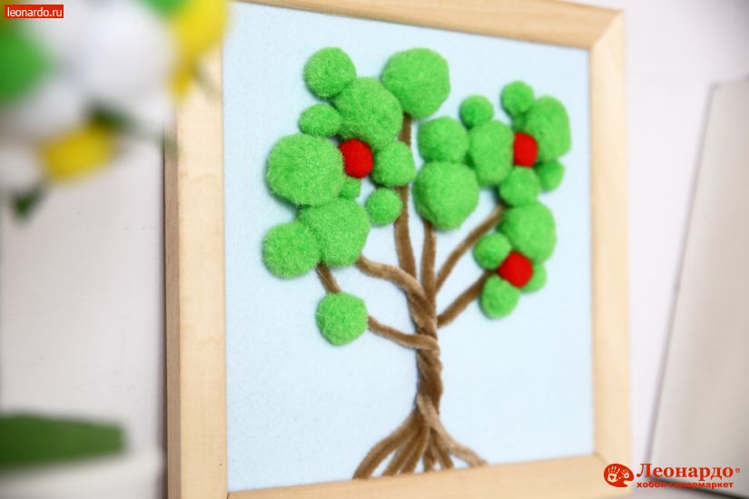 Картину в раме можно не только нарисовать красками, но и сделать объемной! Наш мастер-класс для детей и родителей покажет, как сделать картинку-панно с красивым яблоневым деревом, используя материалы для творчества Hobbius – разноцветные помпоны и пушистую проволоку шенил.