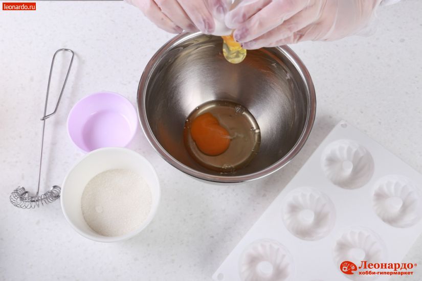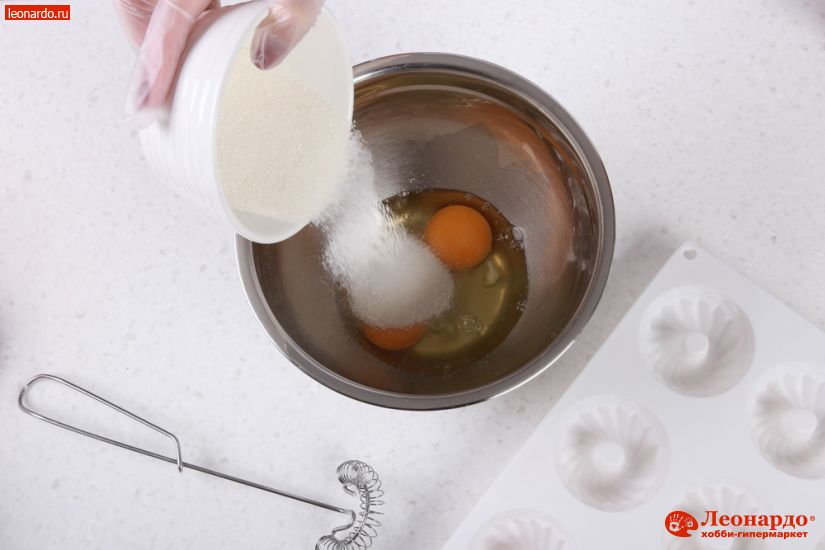 1. В емкость для взбивания разбить яйца, добавить сахар и хорошо перемешать венчиком до образования однородной массы.