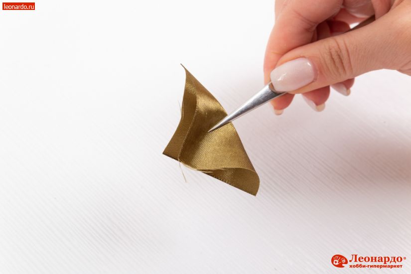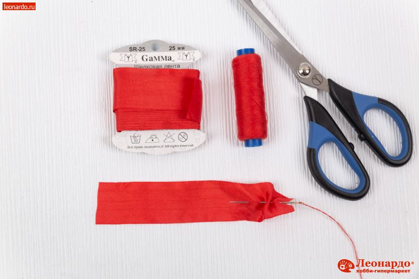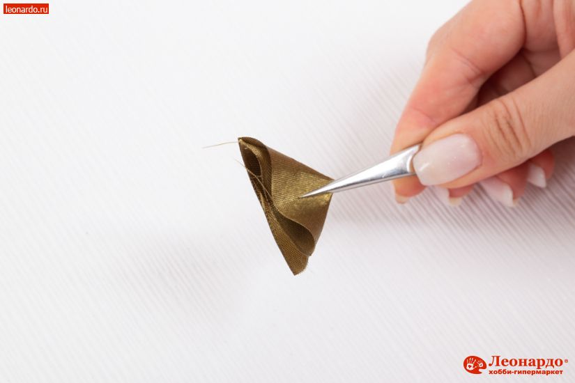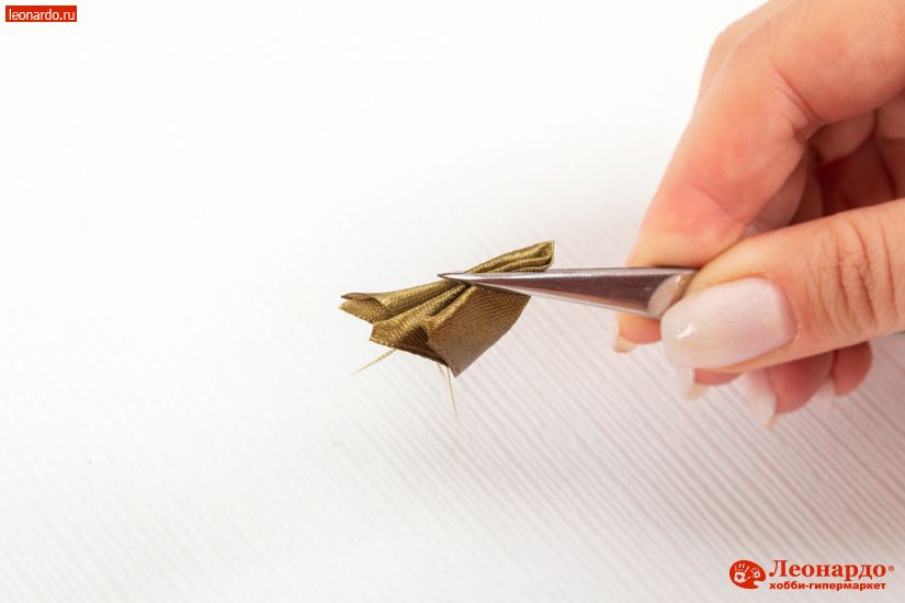 13. Отрезок шелковой ленты GAMMA (арт. SR-25) длиной 12 см собираем по центру на нить. Стягиваем нить и формируем розетку.