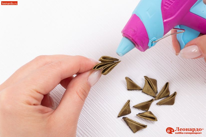 3. Оборачиваем ленту вокруг каждого луча в виде треугольника. Концы лент сразу подклеиваем в центре с помощью клеевого пистолета Micron (арт. MGG-25).