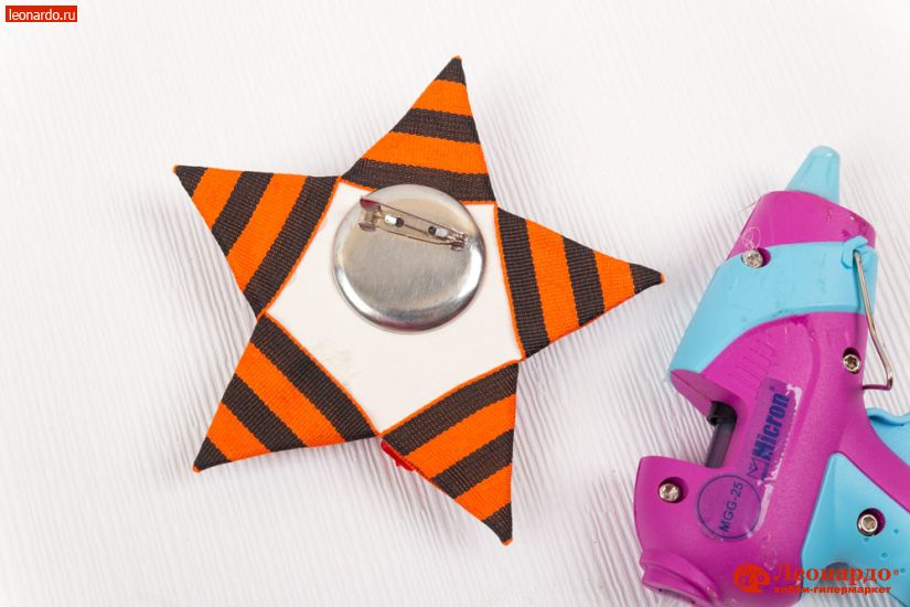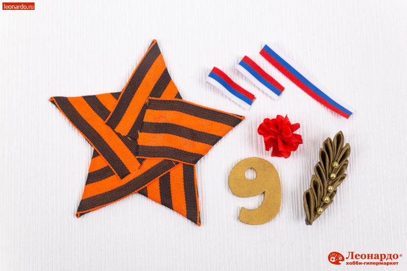 14. Сборка броши: оклеенная заготовка в форме звезды, покрашенная цифра 9, лавровая ветвь, цветок гвоздики и три отрезка ленточки триколор GAMMA (арт.TKR-10) длиной 6 см.