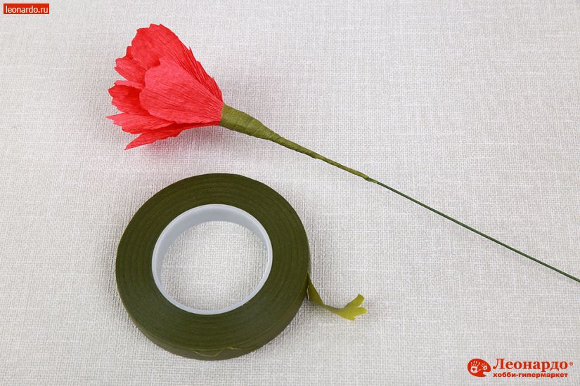 9. Обмотаем основание чашелистиков и стебель лентой. Примотаем еще несколько листочков.