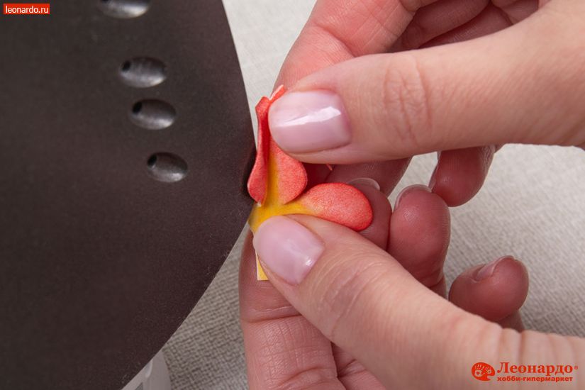 23. На ножку губы (со стороны рисунка) наносим каплю горячего клея и приклеиваем по центру с обратной стороны лепестков.