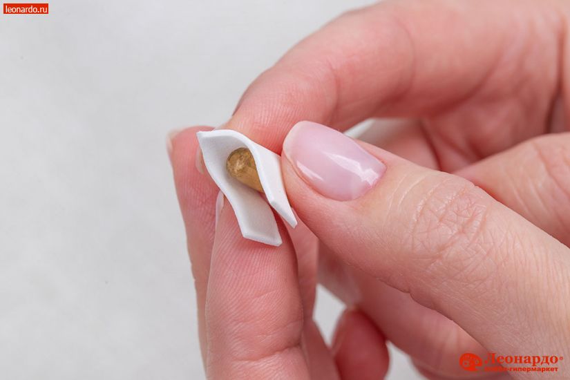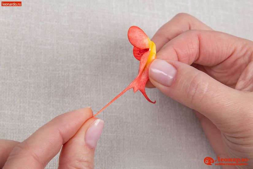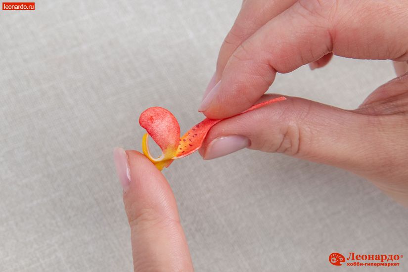 30. Боковые лепестки (петалии) с губой крепим к чашелистику (сепалии). Наносим каплю горячего клея на обратную сторону петалий и подклеиваем к чашелистику по центру.
