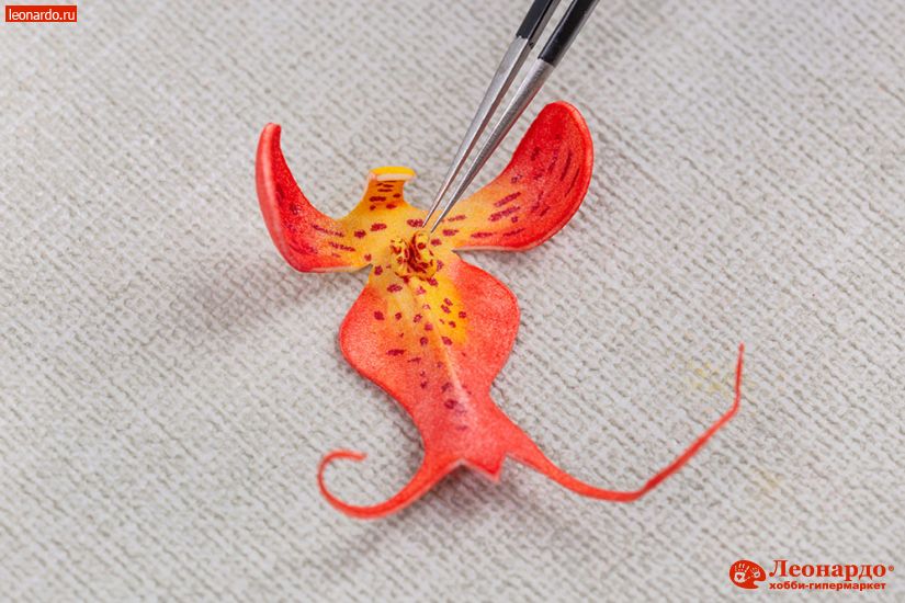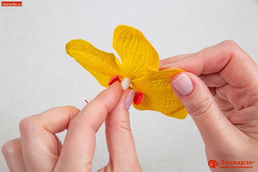 32. Наносим горячий клей на сторону противоположную «носику» колонки. Аккуратно крепим в центре боковых лепестков. «Носик» колонки должен смотреть на губу орхидеи.