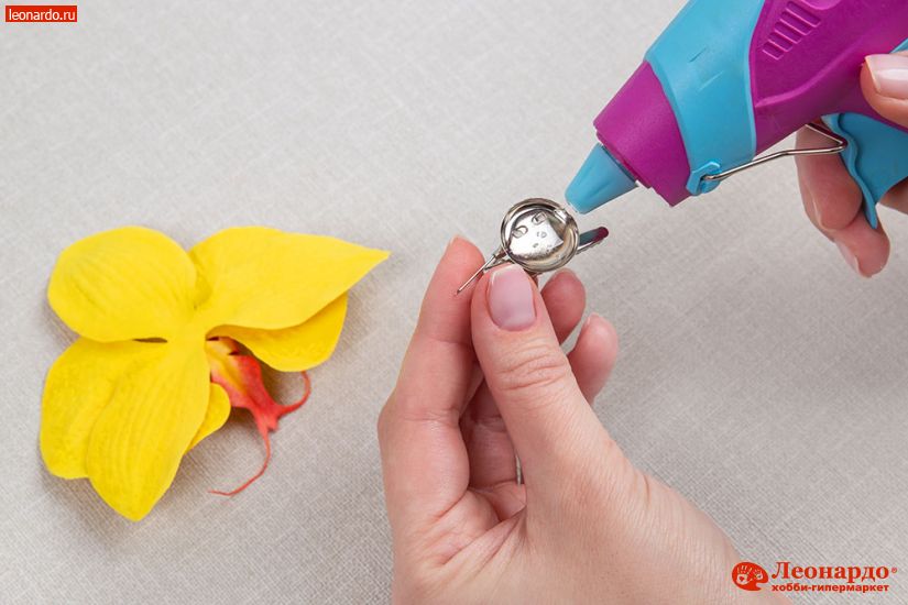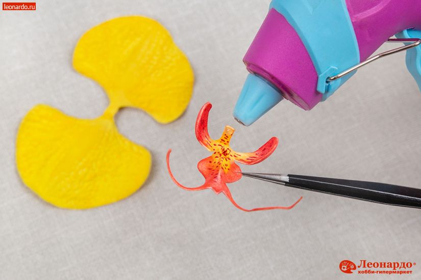 7. С помощью клеевого пистолета Micron (арт. MGG-25), склеиваем сепалии (верхний и боковые чашелистики), затем склеиваем петалии (боковые лепестки).