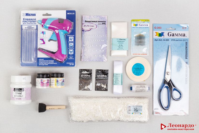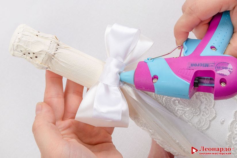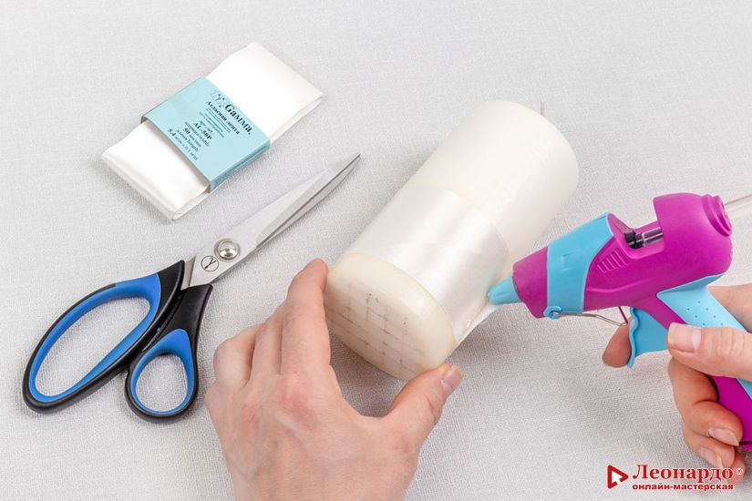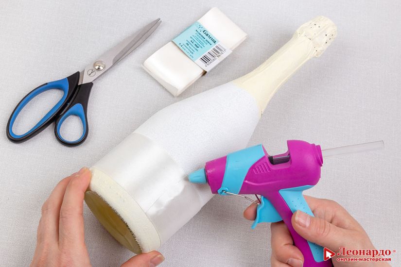 2. По бутылке отмеряем нужное количество атласной ленты GАММА, арт. AL-50P (50 мм (2 "), ФАСОВКА 5.4 м, №042 молочный), отрезаем ножницами GАММА, арт. G-303 и фиксируем клеевым пистолетом Micron, арт.MGG-25