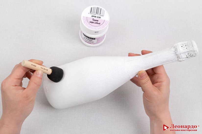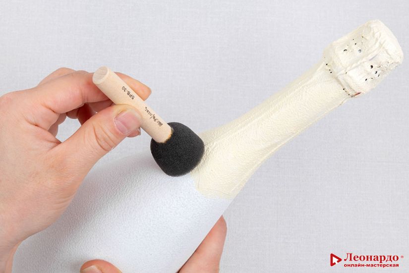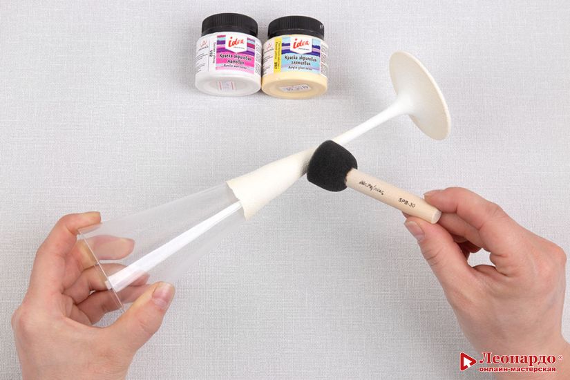 1. Грунт Love2art (арт. APW-230) наносим поролоновой кистью Mr.Painter (арт. SPB-30) на бутылки и бокал, бокал грунтуем на половину. Можно загрунтовать несколько раз для плотности окрашивания. Затем смешиваем краски VISTA-ARTISTA idea (арт. IMA-50 №102 белый, №207 пастельно желтая) до бледно-желтого цвета, тонируем только верхние и нижние части.