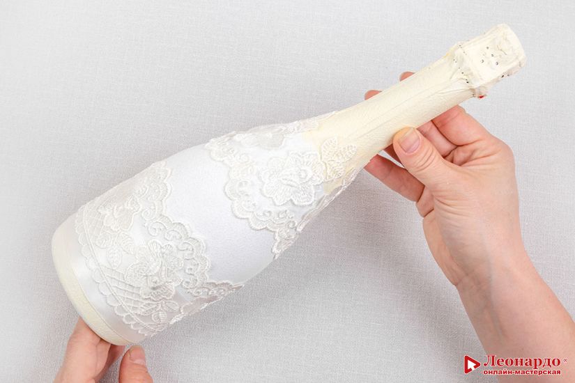4. Этим же кружевом оборачиваем бутылку по верх атласной ленты, отрезаем нужный размер и фиксируем клеевым пистолетом. В верхней части бутылки декорируем вырезанными элементами и также фиксируем на клеевой пистолет.