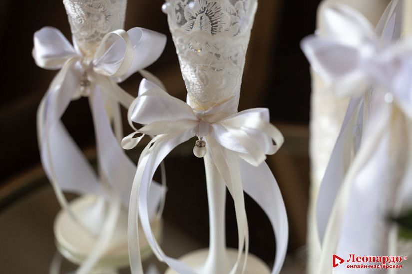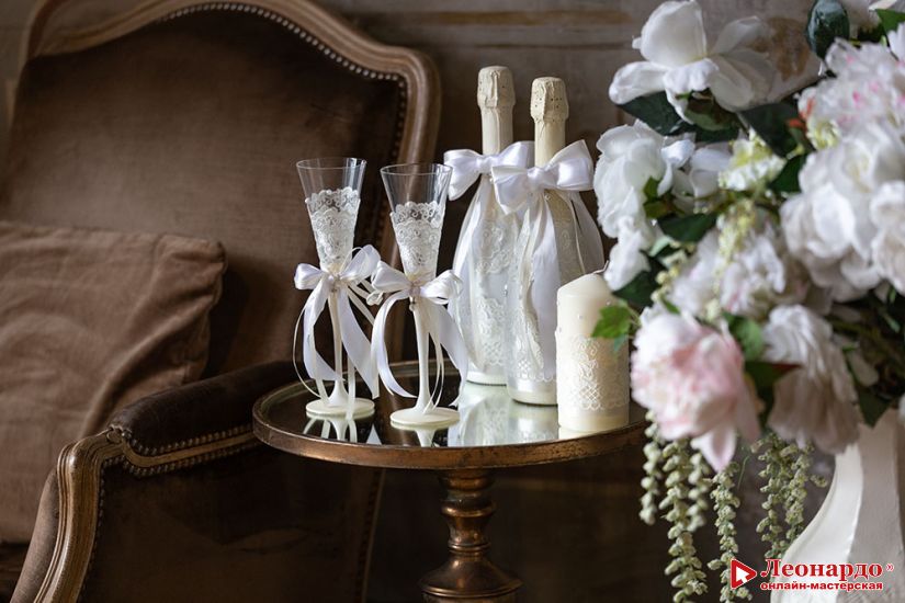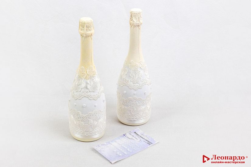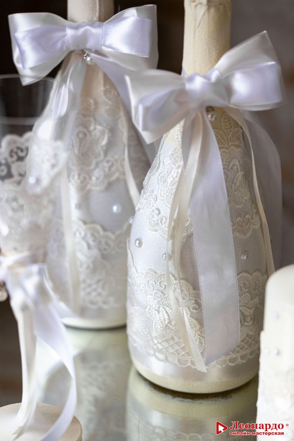 День свадьбы – совершенно особенный момент, и всё в этот день должно быть особенным. Наш мастер-класс – это отличная возможность сделать запоминающийся подарок к важной дате. Нежный комплект из двух бутылок шампанского, бокалов для него и свечи, задекорированных молочным кружевом, лентами и бусинами, вы легко сделаете своими руками. А, самое главное, вложите в него частичку любви!