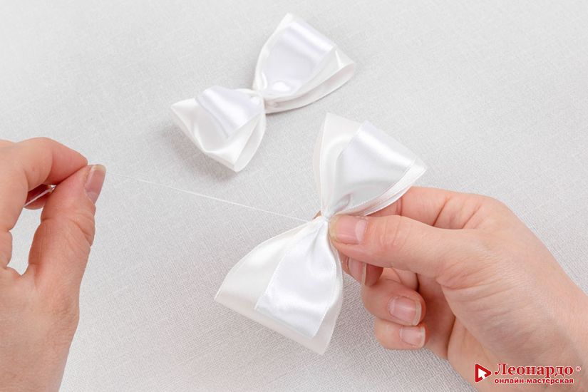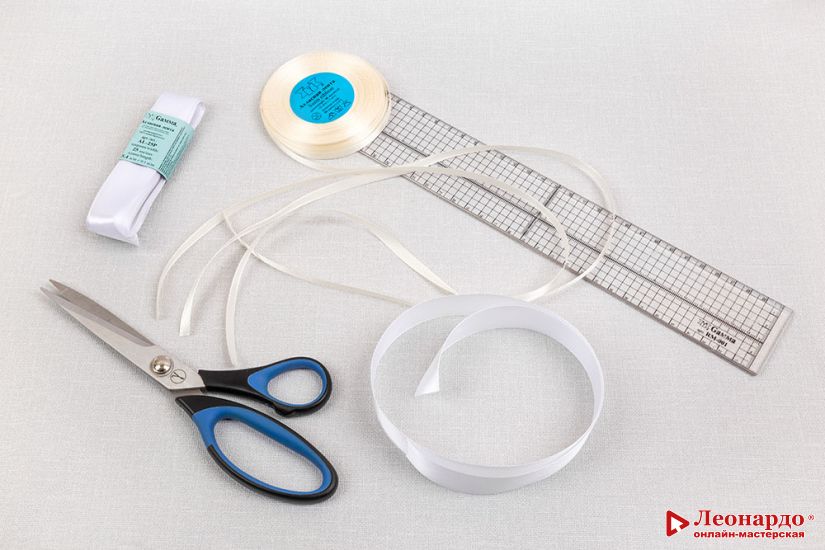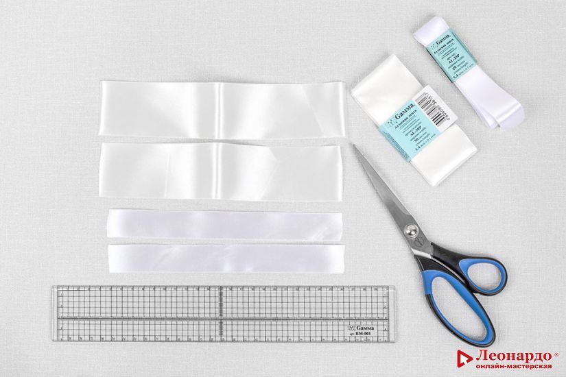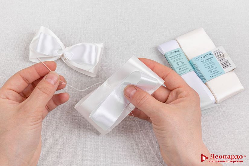 6. Нарезаем из атласных лент GАММА (арт. AL-25P №001 белый) и (арт. AL-50P №042 молочный) по 2 отреза размером 20 см. Клеевым пистолетом склеиваем ленты в кольцо. Кольца складываем пополам и накладываем друг на друга, на широкую ленту накладываем четко по середине узкую ленту и прошиваем широким стежком, затем стягиваем.