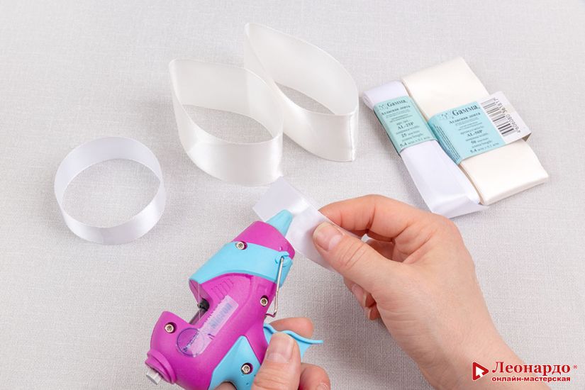 8. Из атласной ленты GАММА (арт. AL-25P №001 белый) делаем перемычку 3,5 см и с изнанки фиксируем клеевым пистолетом.
