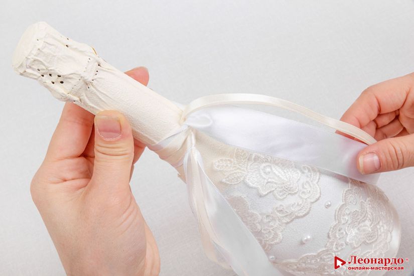 9. Для завязки нам понадобится 1 отрез 50 см ленты атласной GАММА (арт. AL-25P №001 белый) и 2 отреза по 50 см ленты атласной GАММА (№075 кремовый), оборачиваем горлышко бутылки и завязываем узел.