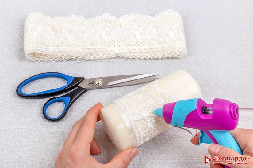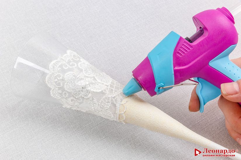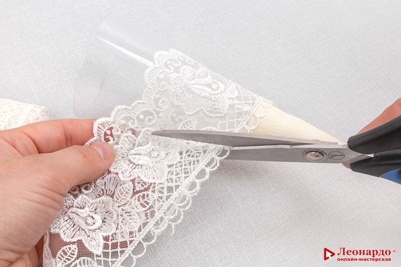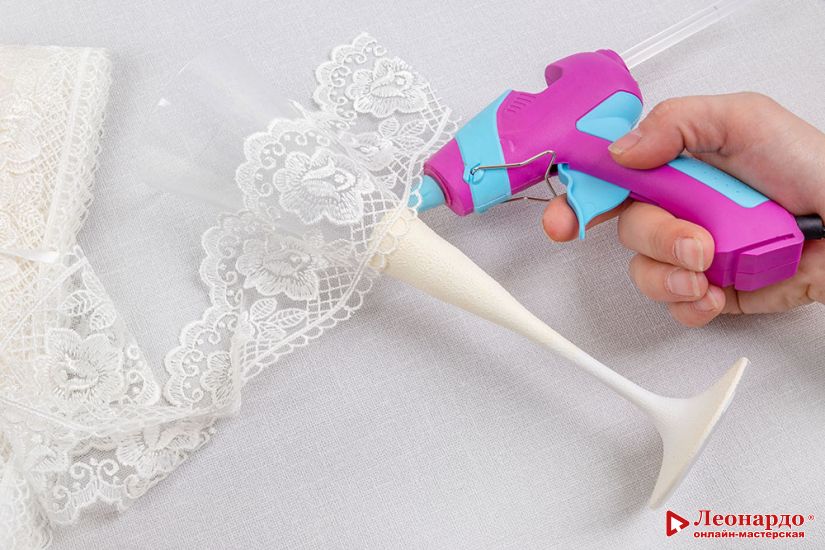 11. Отрезаем по размеру бокала кружево и фиксируем края на клеевой пистолет.