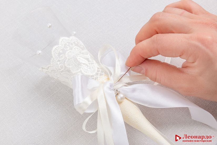 13. Для завязки нам понадобится 1 отрез 50 см ленты атласной GАММА (арт. AL-25P №001 белый) и 2 отреза по 50 см ленты атласной GАММА (№075 кремовый), оборачиваем ножку бокала и завязываем красивый бант.