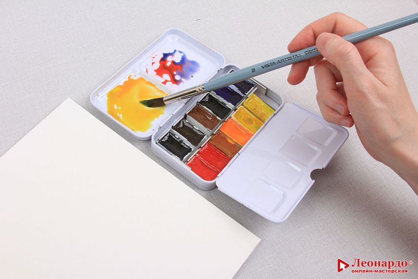 2. Краска акварель кювета VISTA-ARTISTA Studio, арт. VAW 2.5 мл (204 лимонная, 205 желтая, 209 золотистая, 213 охра золотистая, 302 красная, 308 кармин, 501 голубая, 511 ультрамарин, 612 зеленая, 712 умбра жженая, 714 сепия, 806 черная)