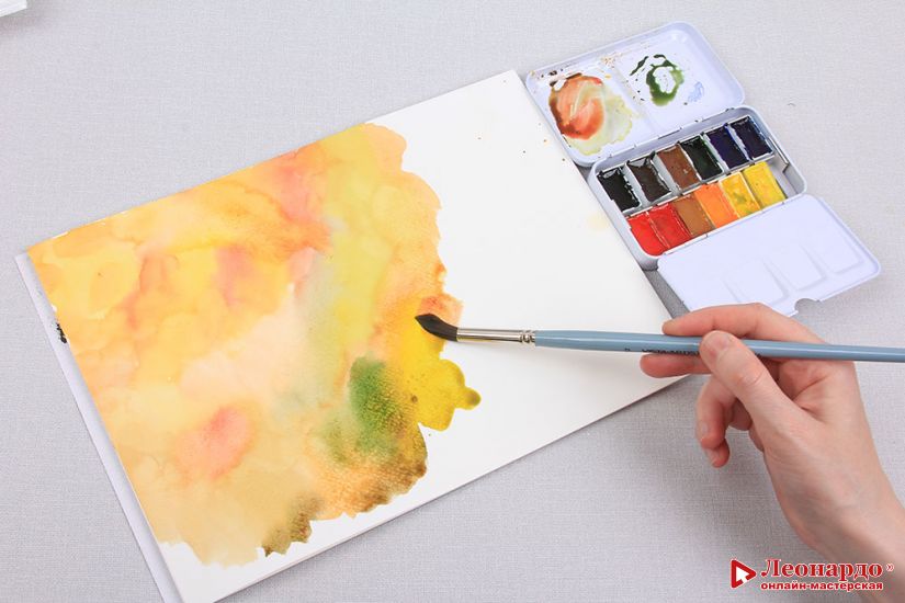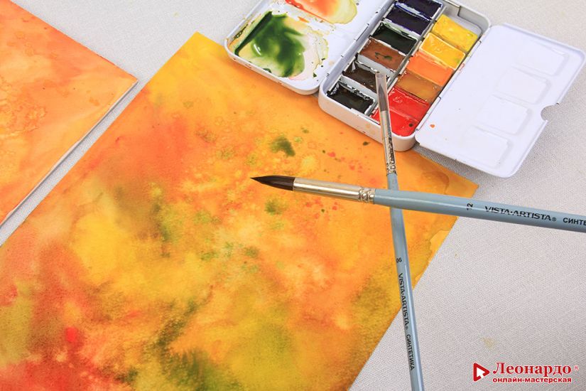 Для разнообразия цветов красим таким образом сразу два листа акварельной бумаги.