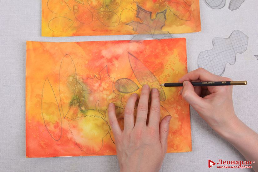 7. Прикладываем прозрачные листочки-выкройки к высохшим акварельным листам. Выбираем наиболее подходящие по цвету места, и переносим контур выкройки.