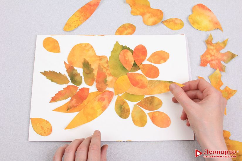 10. Не приклеиваем все листочки сразу, обязательно несколько раз перекладываем все элементы в поисках максимально-гармоничной картинки. Ищем красивые сочетания листьев по размеру и цвету.