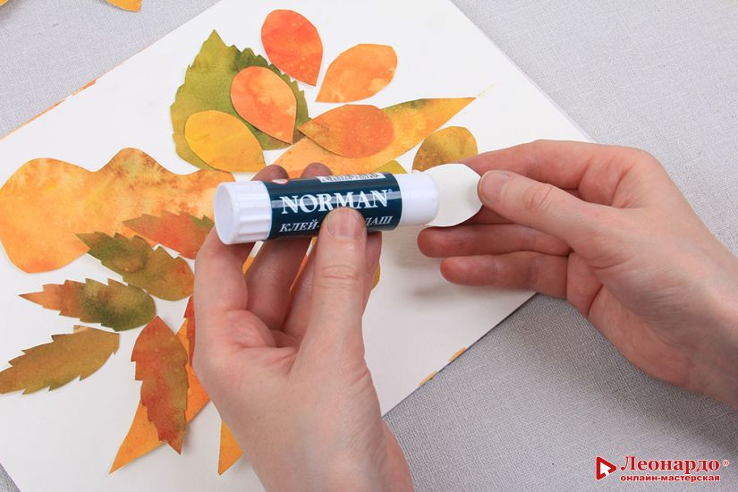 11. Когда композиционное решение найдено, приклеиваем листья на клей-карандаш.