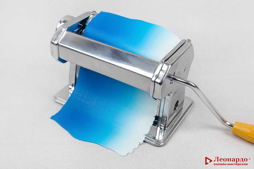 6. Прокатываем получившийся пласт на средней толщине паста-машины, из синей глины формируем колбаску и оборачиваем ее пластом с переходом цвета.