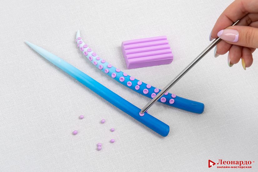 10. Шарики располагаем на щупальцах в два ряда, круглой частью стека Fiorico (арт. FIO-S/04) продавливая серединку. Отступаем от края около 4 см, снизу крепим более крупные шарики, ближе к светлой части щупальца – маленькие.