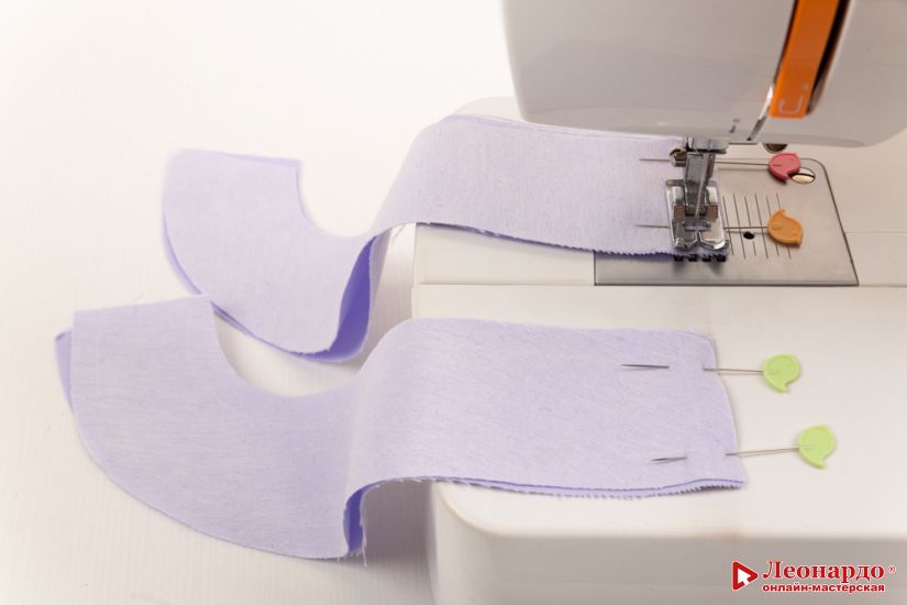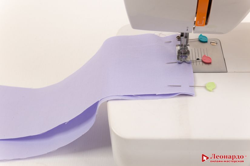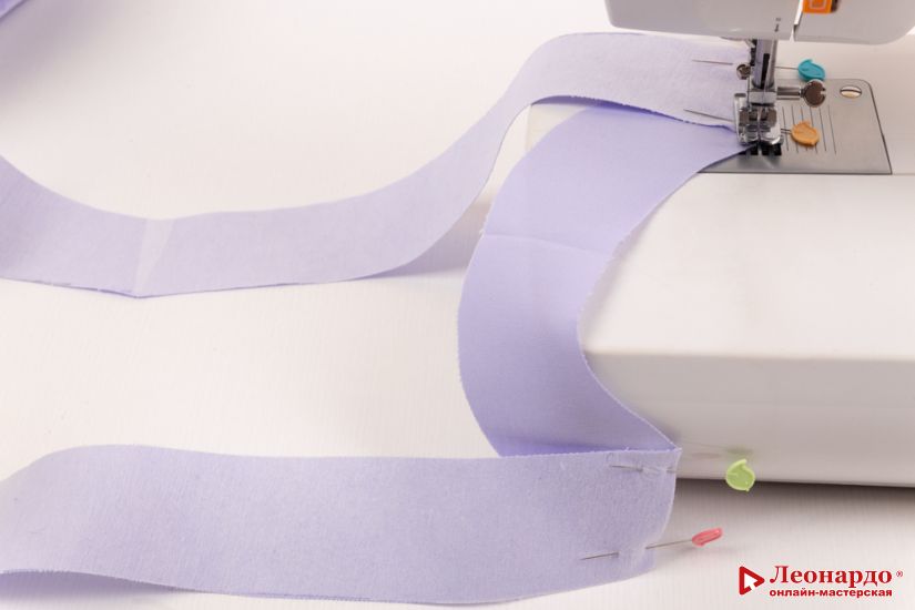 22. Стачиваем между собой короткие срезы на двух полосках для пояса. Для этого складываем их лицевыми сторонами внутрь, скалываем и прокладываем строчку на швейной машинке.