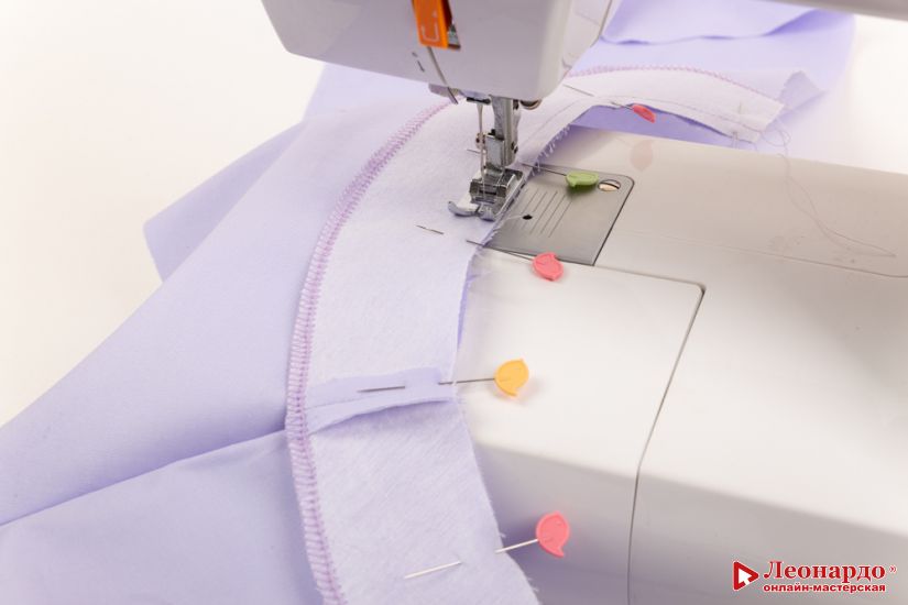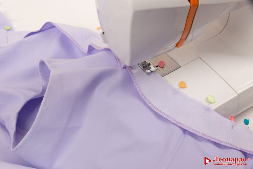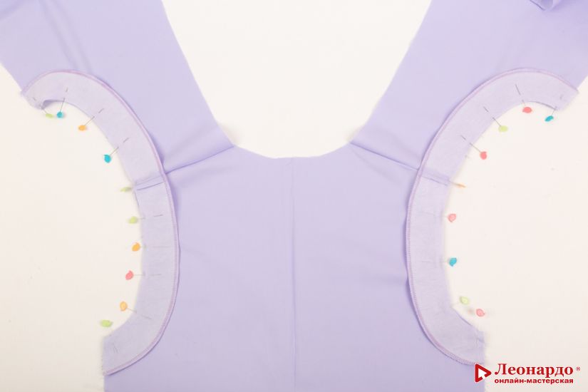 4. Скалываем булавками и стачиваем на швейной машинке плечевые швы обтачек пройм.