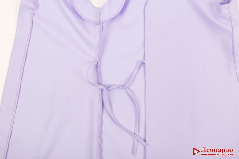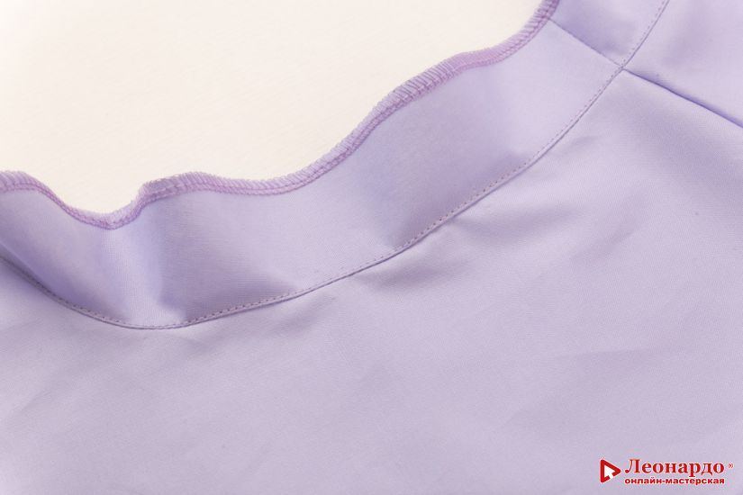 21. Обтачку заутюживаем на припуск и прокладываем строчку близко к линии притачивания. Вручную закрепляем обтачку к припускам плечевых швов, делаем закрепки в виде нескольких стежков.