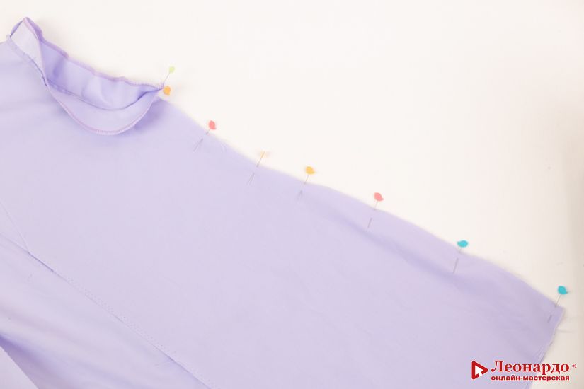 3. Скалываем булавками и стачиваем плечевые швы. Припуски обрабатываем на оверлоке.