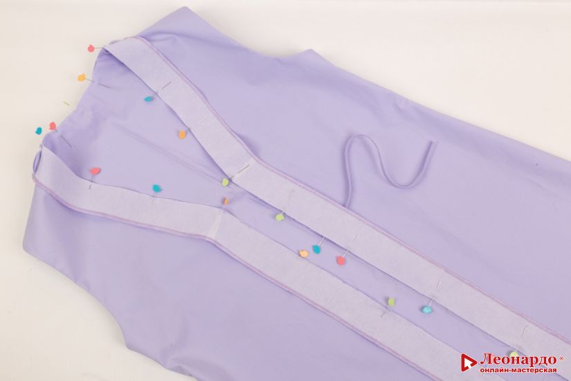 18. Обтачку накладываем на жилет лицевой стороной к лицевой стороне и прикалываем. Под одну из обтачек (левая сторона) вкладываем одну из завязок для внутреннего пояса. Место для внутреннего пояса отмечаем на примерке.
