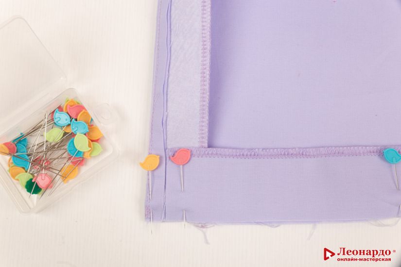 27. Вручную выполняем подгибку низа жилета; для этого припуск предварительно приутюживаем и прикалываем с изнаночной стороны изделия.