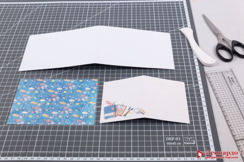 1. Из однотонной бумаги для скрапбукинга Mr.Painter (арт. PSTM) вырезаем прямоугольник 11х30 см и складываем его пополам по длинной стороне при помощи палочки для биговки. Из листа скрап бумаги «Осенний этюд» (1) вырезаем макетным ножом по линейке прямоугольник 10,5х14,5 см. Из листа скрап бумаги «Садись, пять» (4.1) вырезаем деталь 10х14,5 см и складываем пополам по длинной стороне.