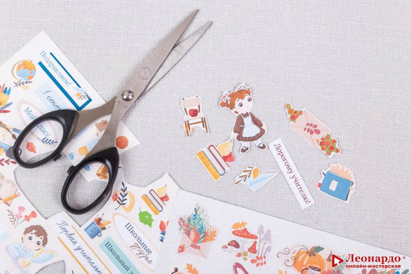 3. Деталь из скрапбумаги «Садись, пять» приклеиваем поверх фонового листа, слегка выгнув так, чтобы по форме он напоминал открытую книгу.