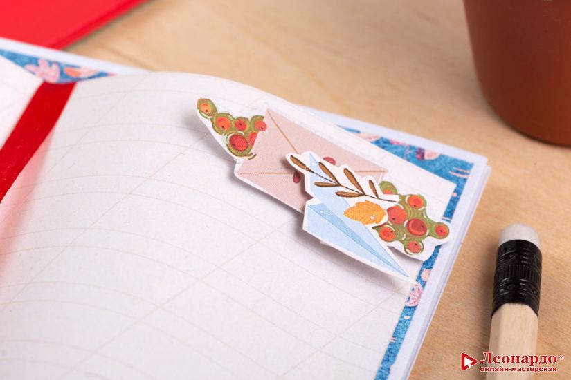 5. Композиции из вырезанных элементов располагаем в левом нижнем и правом верхнем углу открытой книги, приклеивая элементы слоями на объемные клеевые подушечки Mr.Painter (арт. DST-02).