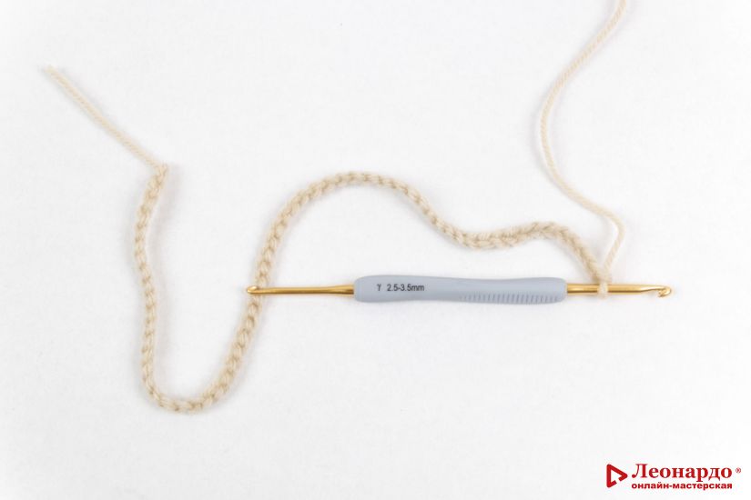 1. Пряжей основного цвета ADELIA "TINA" (№135 песочный) набираем цепочку из 76 воздушных петель (далее вп) крючком номер 3,5 GAMMA (арт. RHD)