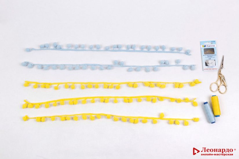 6. Нарезаем тесьму BLITZ (арт. FBL-02 №129 голубой, №128 желтый) примерно по 48-50 см. по 2 голубых и по 3 желтых отрезка на каждую сторону наволочки.