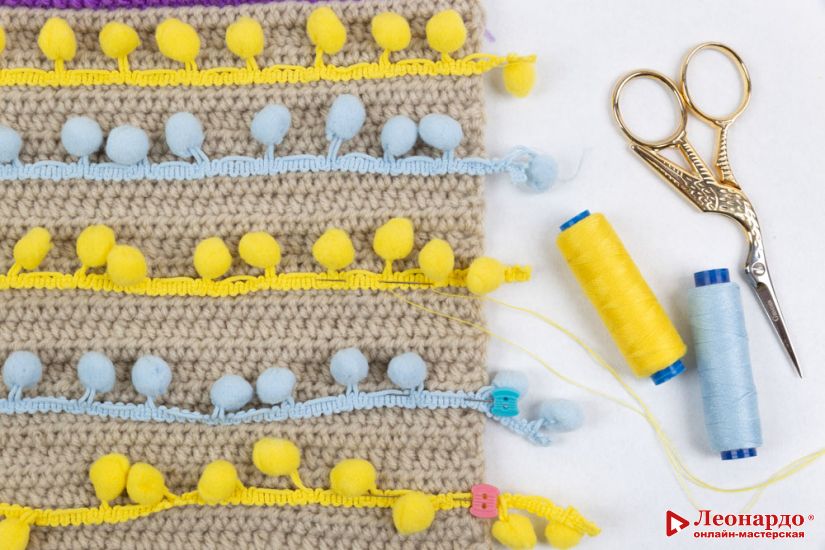7. Равномерно распределяем тесьму по детали основного цвета.