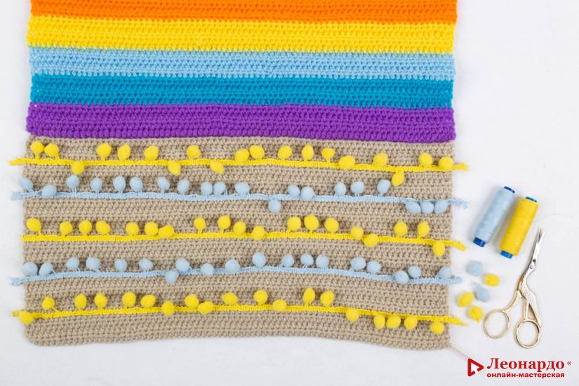 8. Цвета чередуются: №037 фиолетовый, №139 яр.голубой, №043 бл.синий, №007 яр.желтый, №165 неон.оранжевый, №169 неон.розовый) №025 яр. розово-сиреневый и после повторяются. Заканчиваем деталь двумя рядами основного цвета.