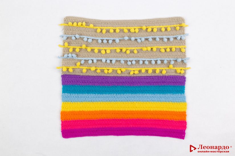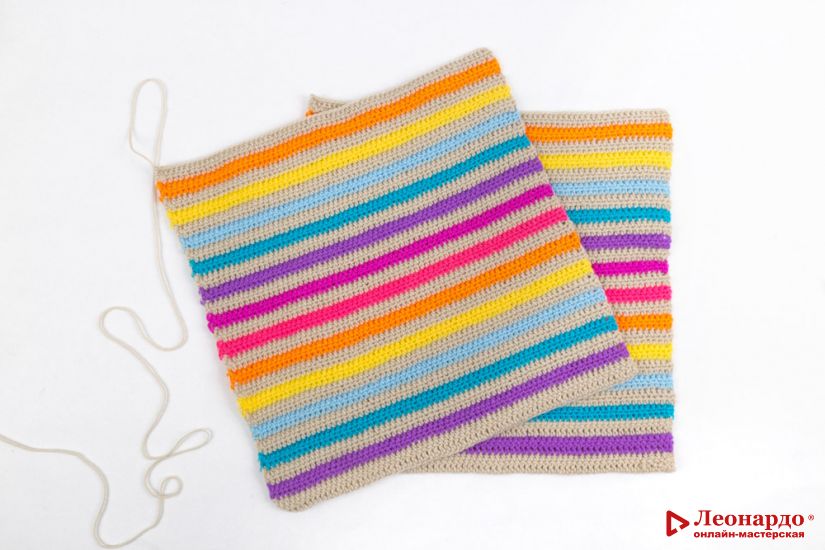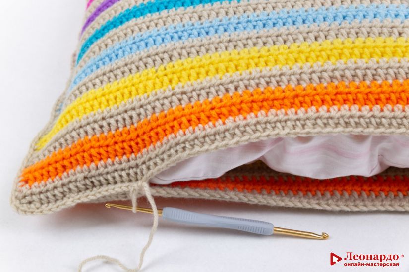 9. Аналогично вяжем вторую сторону наволочки. При вязании второй детали нить основного цвета не обрезаем, а оставляем её для обвязки. Концы цветных нитей завязываем простым узлом и заправляем на изнаночную сторону.