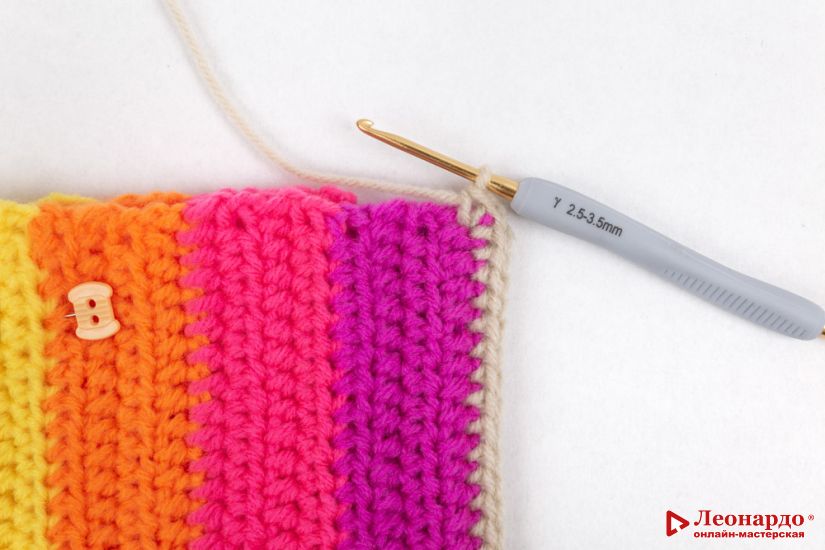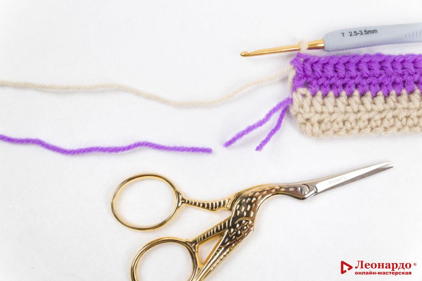 3. Важно – последний псн в ряду набираем той нитью, которой вязали, а заканчиваем нитью нового цвета.