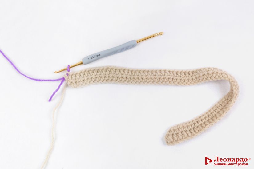 2. Переходим на крючок номер 2,5. 2 вп для подъема. Вяжем 76 псн в каждом ряду. Вяжем два ряда нитью основного цвета. Меняем нить на фиолетовую.