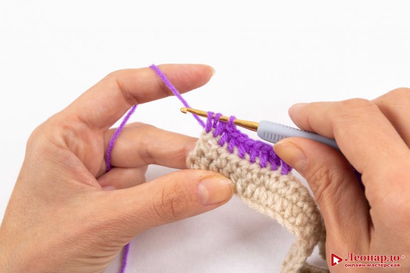 6. Вяжем два ряда фиолетовой нитью, последний псн заканчиваем нитью основного цвета. Фиолетовую нить обрезаем.