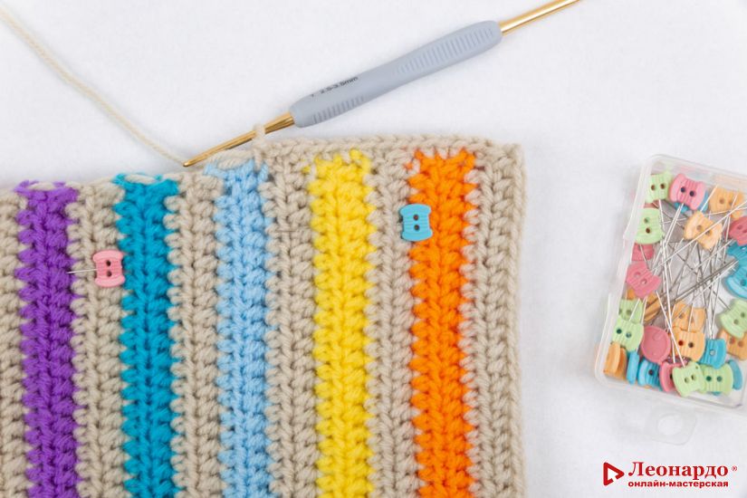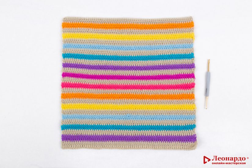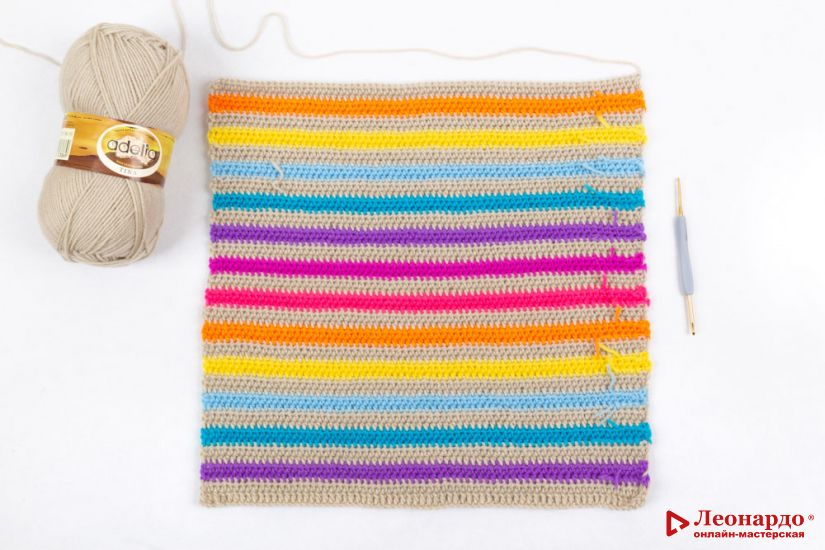 5. Вяжем псн по 4 ряда каждого цвета: №037 фиолетовый, №139 яр.голубой, №043 бл.синий, №007 яр.желтый, №165 неон.оранжевый, №169 неон.розовый, №025 яр. розово-сиреневый.