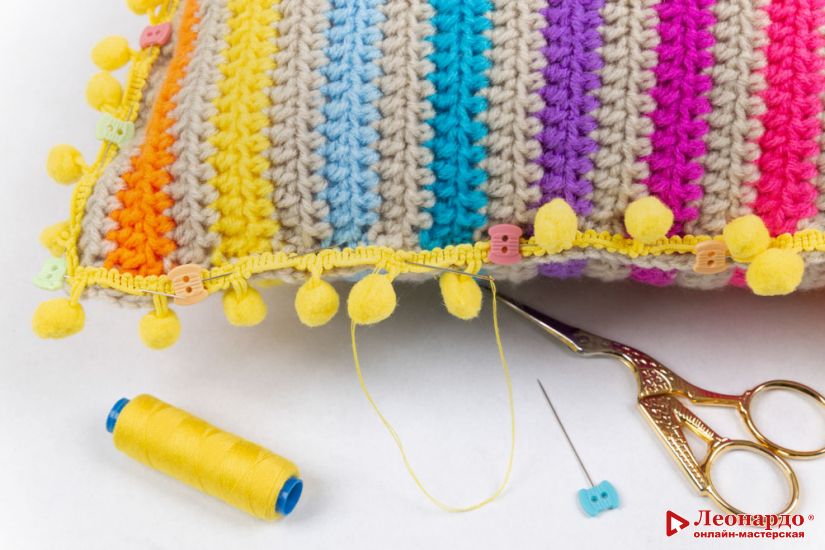12. Прикалываем тесьму (№128 желтый) и пришиваем её по периметру подушки.