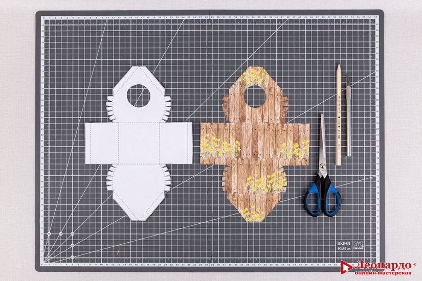1. Шаблон домика прикладываем к листу скрап бумаги "Mr.Painter" (арт. PSR 210506 "Лето. Дача. Я." 5) и обводим карандашом "ВКФ" "ИНЖЕНЕР" (арт. 1237 (ТМ (HB)). Вырезаем заготовку домика ножницами "Gamma" (арт. G-204) по сплошным линиям.