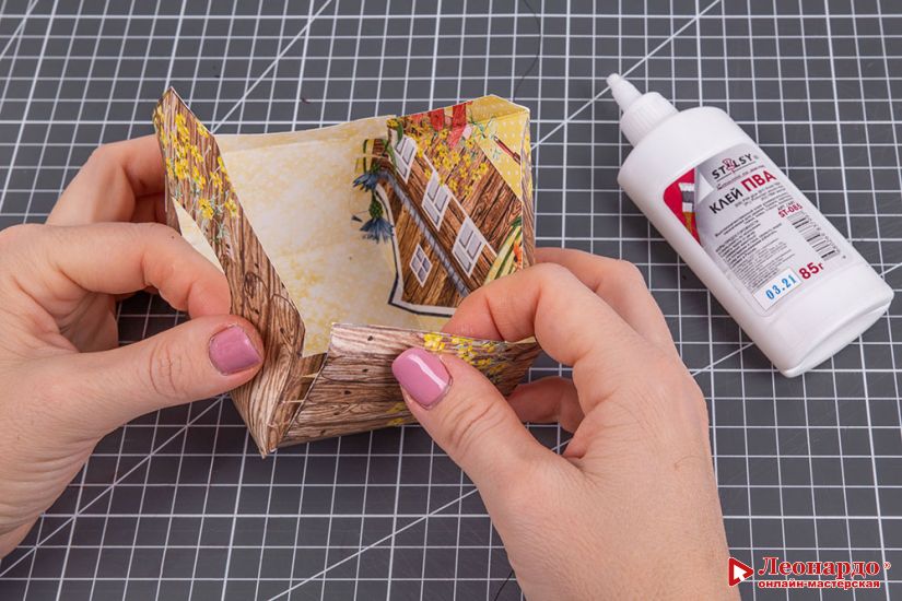 4. Складываем деталь и склеиваем стороны зубчатыми краями внутрь домика.