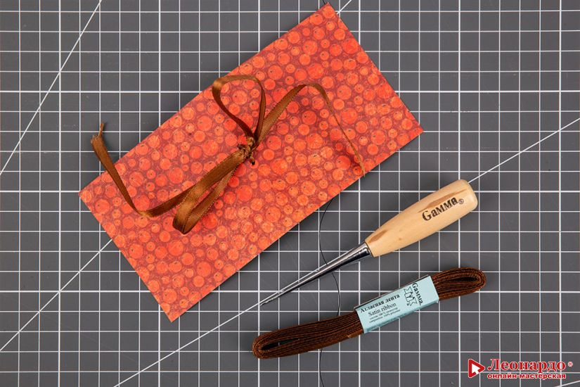 6. На сгибе в самом центре детали прокалываем шилом "Конус" "Gamma" (арт. CON-02) два отверстия на расстоянии 5 мм друг от друга. Вдеваем в отверстия атласную ленту "Gamma" и завязываем на бант.