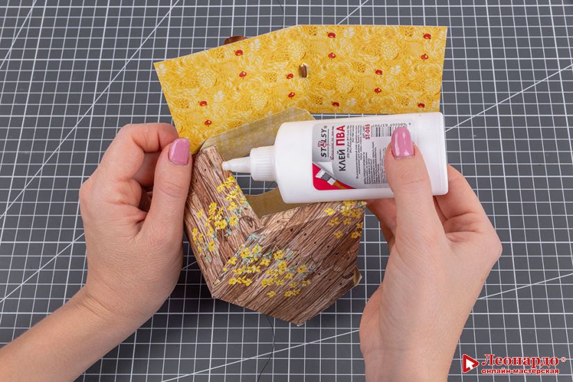 7. Смазываем края домика сверху и приклеиваем деталь крыши.